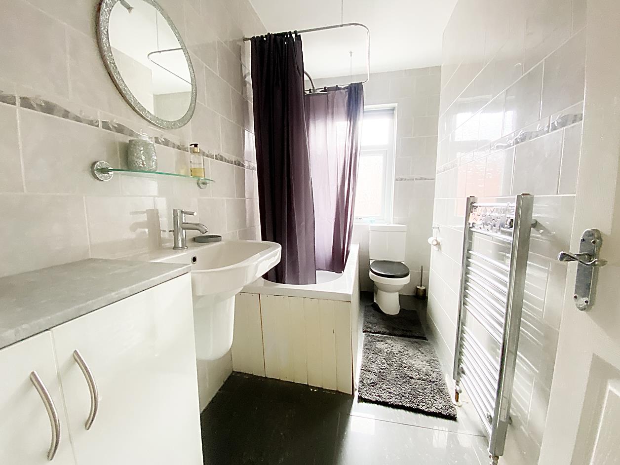 Bathroom - 3.04 x 1.37 (9'11" x 4'5") - Bath with shower over, WC and wash hand basin. Double glazed window, ladder style radiator.