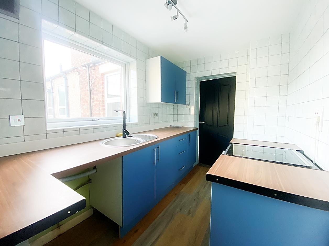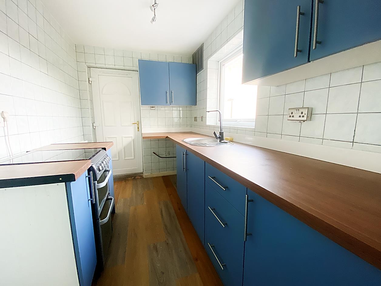 Kitchen - 3.19 x 1.99 (10'5" x 6'6") - Wall and base units with work surfaces over and sink unit, slot in gas cooker, double glazed window, radiator and external door to the rear yard.