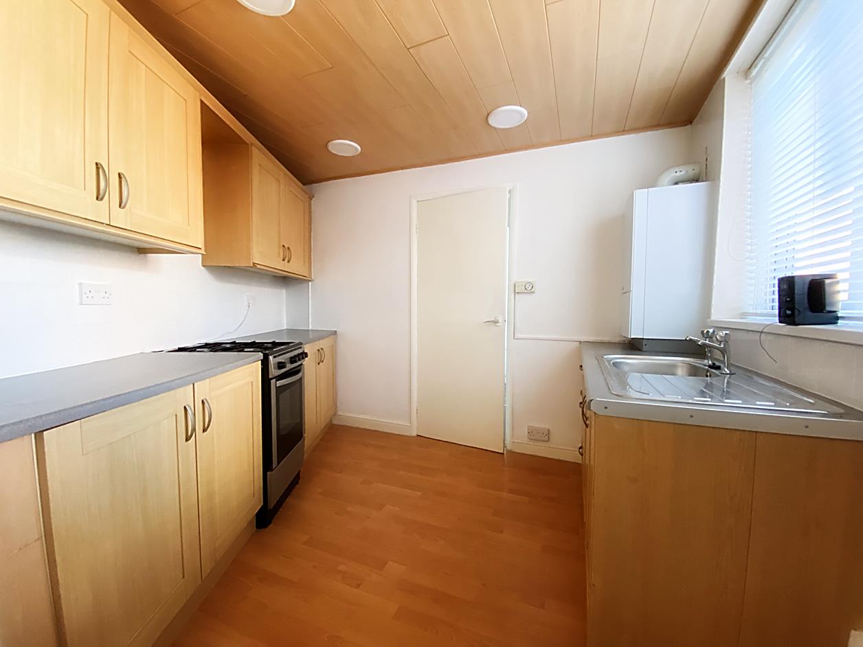 Kitchen - 3.07 max x 2.74 - Fitted with a range of wall and base units with work surfaces over, single drainer sink unit, gas cooker. Double glazed window, part tiled walls.